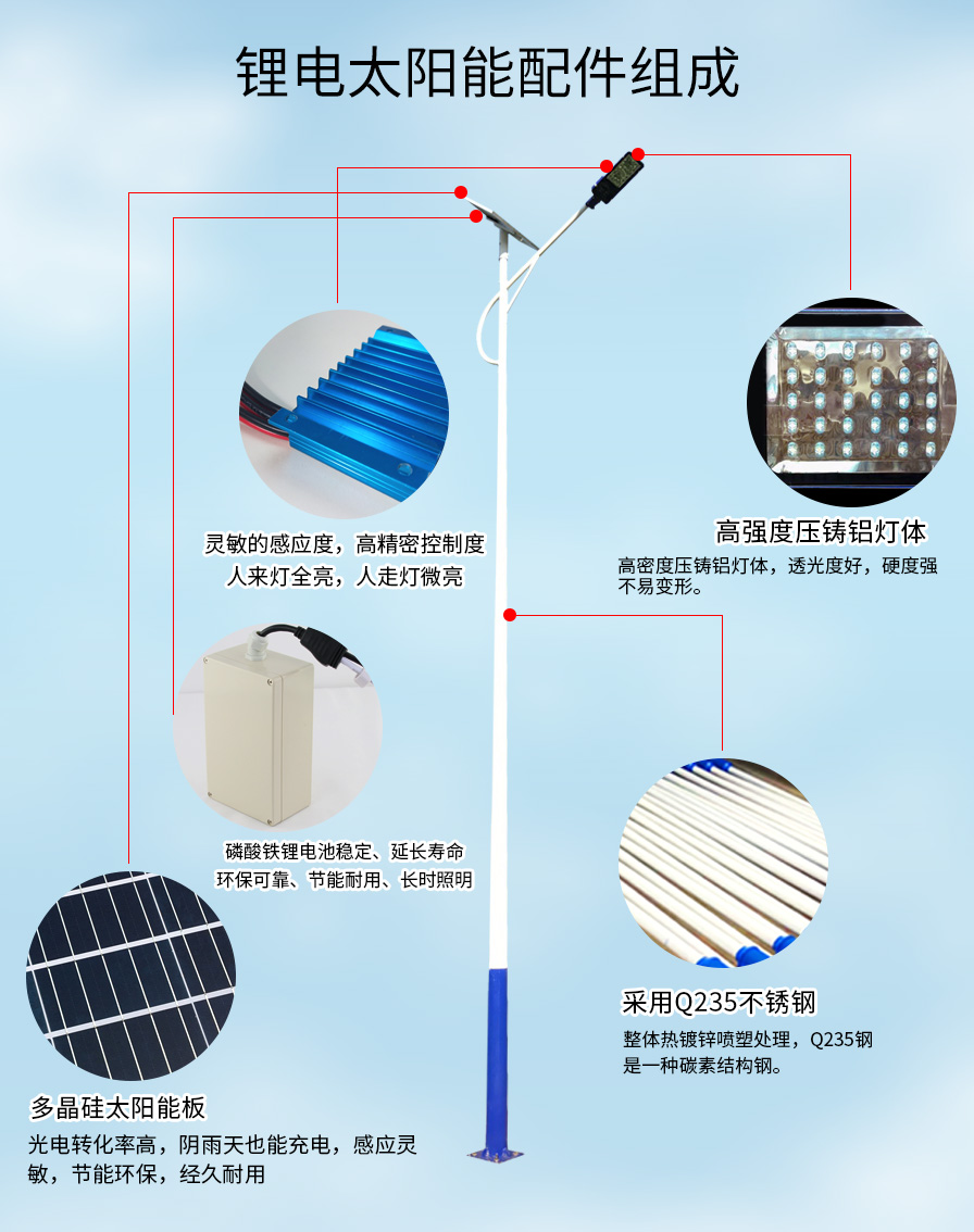 1、 太陽能路燈工作原理是將太陽能提轉化為電能從而實現照明,路燈頂部是太陽能電池板又名光伏組件,白天這些多晶硅制成的光伏組件將太陽能轉化為電能存儲在蓄電池中,使太陽能路燈在智能控制器的控制下,太陽能電池板經過太陽光的照射,吸收太陽能光并轉換成電能,白天太陽電池組件向蓄電池組充電。傍晚,通過控制器的控制將電能輸送給光源,為人們在夜晚進行照明。晚上蓄電池組提供電力給LED燈光源供電,實現照明功能。